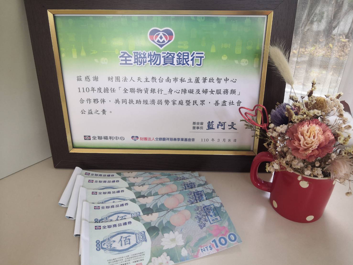 蘆葦於110年再度獲得「全聯慶祥慈善事業基金會」肯定!通過基金會辦理之「全聯物資銀行」專案,今年度基金會捐贈22萬元全聯商品禮卷,預計提供中心所服務之80戶身障家庭生活物資所需,除藉此減輕身障家庭生活支出,更使受助者在受助過程可自立自主的選擇生活所需。
