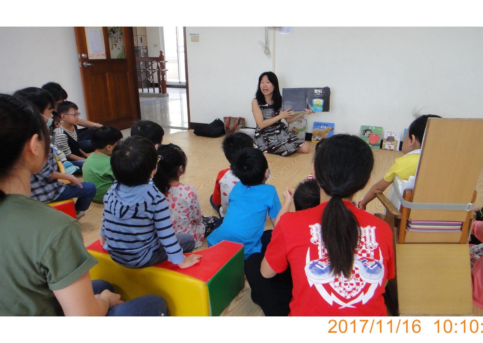 「各位小朋友好,好久不見,今天瓊芬媽咪拿了好多好玩的故事書來分享喔!我們現在全部站起來,先來律動一下,動動手腳,先來跳一下蝴蝶,好不好?」這就是我在蘆葦學前日照班當故事媽媽的開場白。