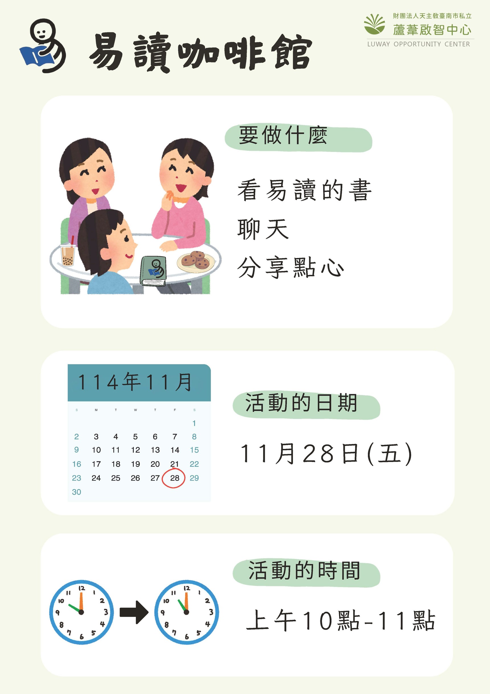 【易讀咖啡館|閱讀‧分享‧好時光】 你是否也喜歡一邊喝飲料、一邊放鬆聊天?歡迎來「易讀咖啡館」度過溫暖又有趣的早晨時光!我們會:輕鬆介紹「什麼是易讀」一起翻閱易讀書,一起說說你的想法吃吃小點心、喝杯飲料、交新朋友一起在溫馨氛圍中,讓閱讀變得更簡單、更有趣!